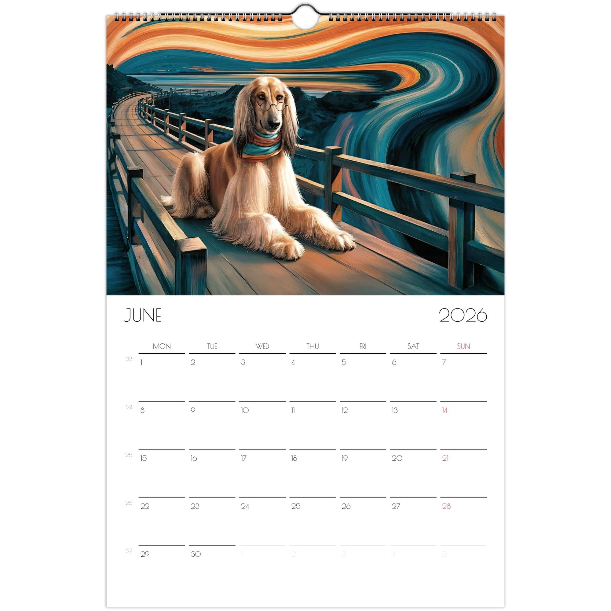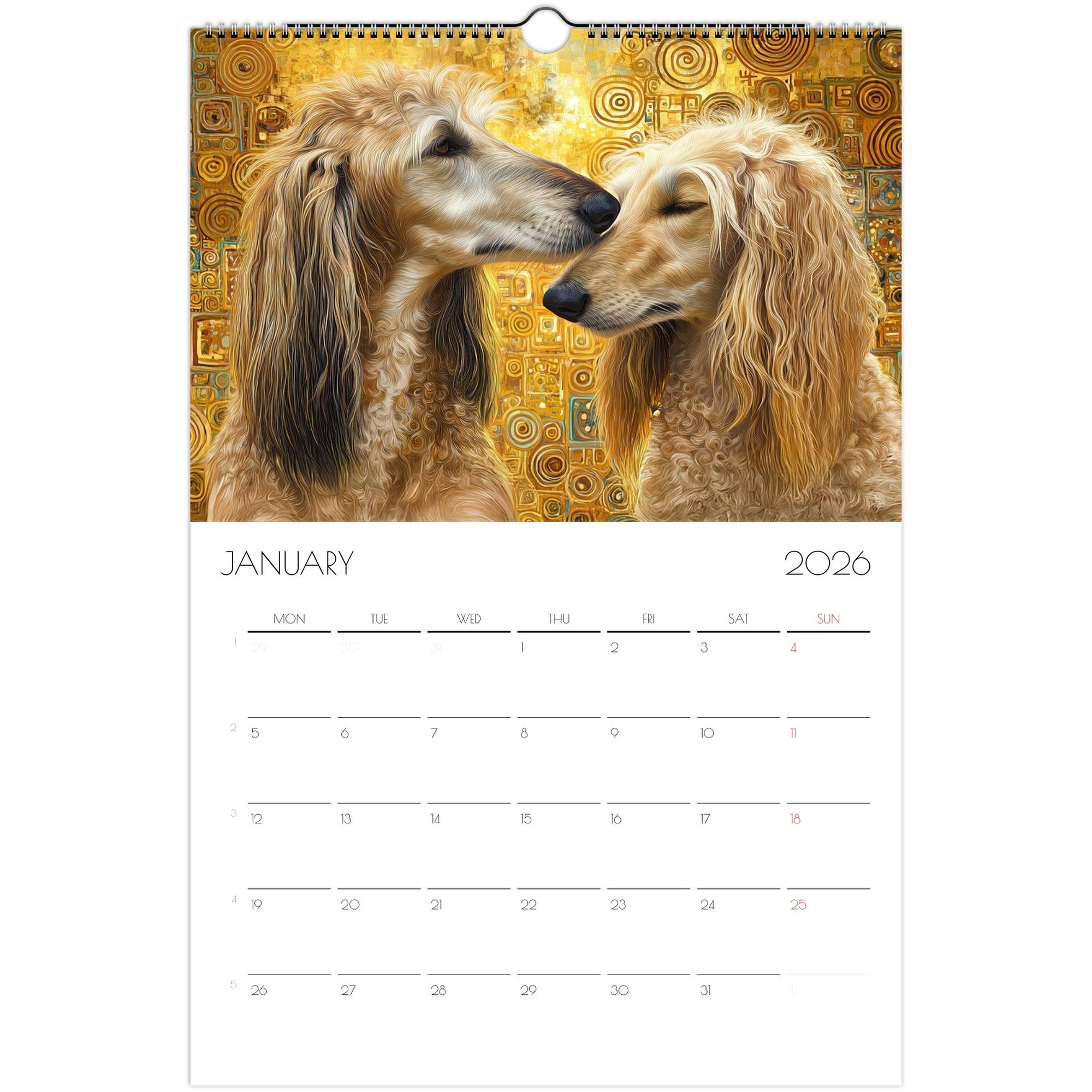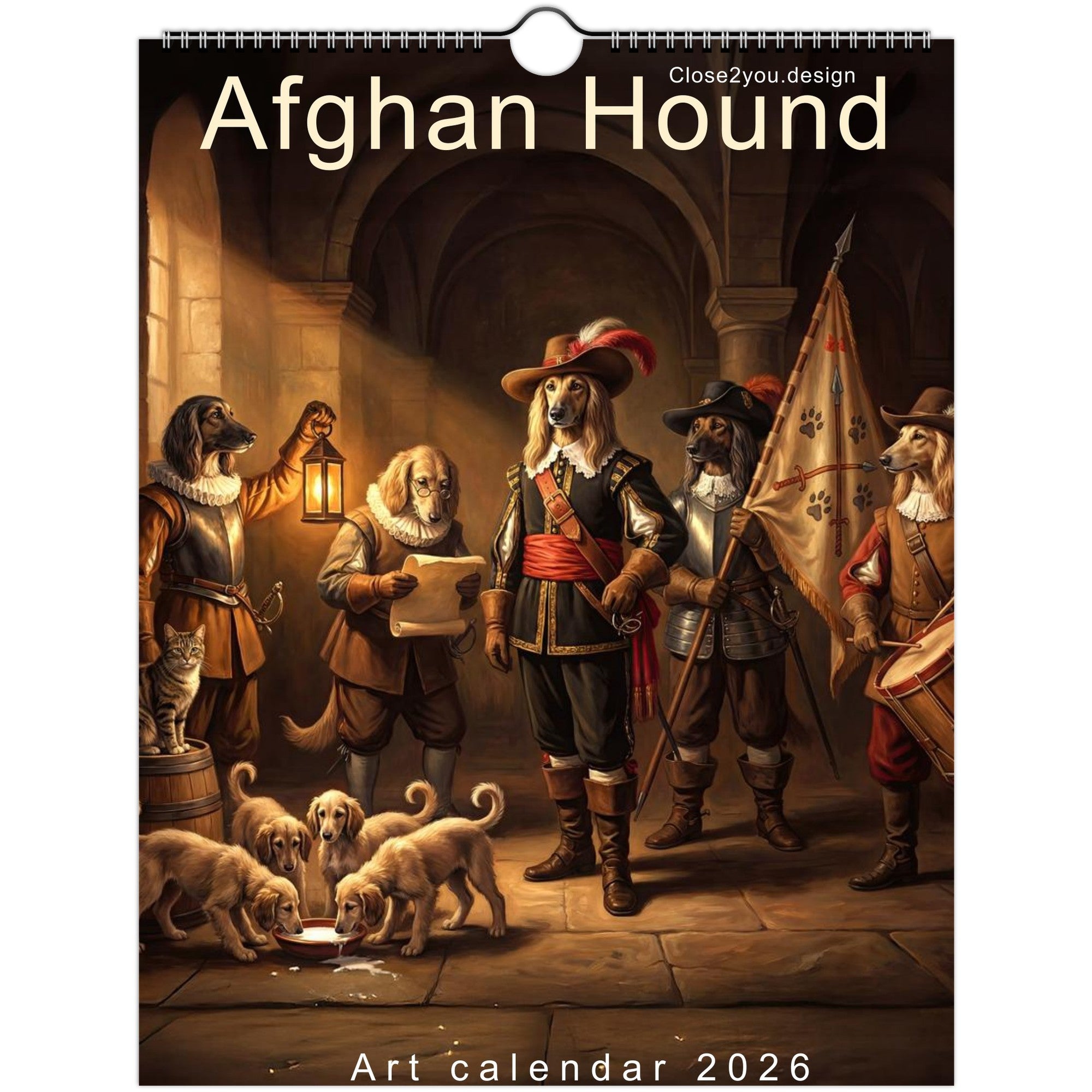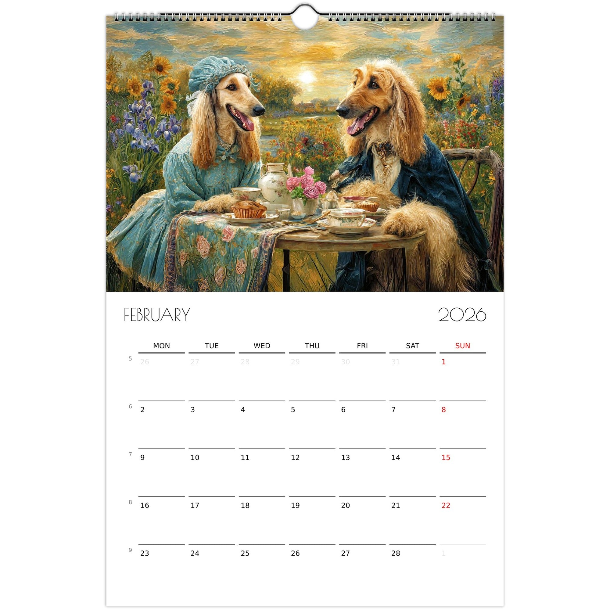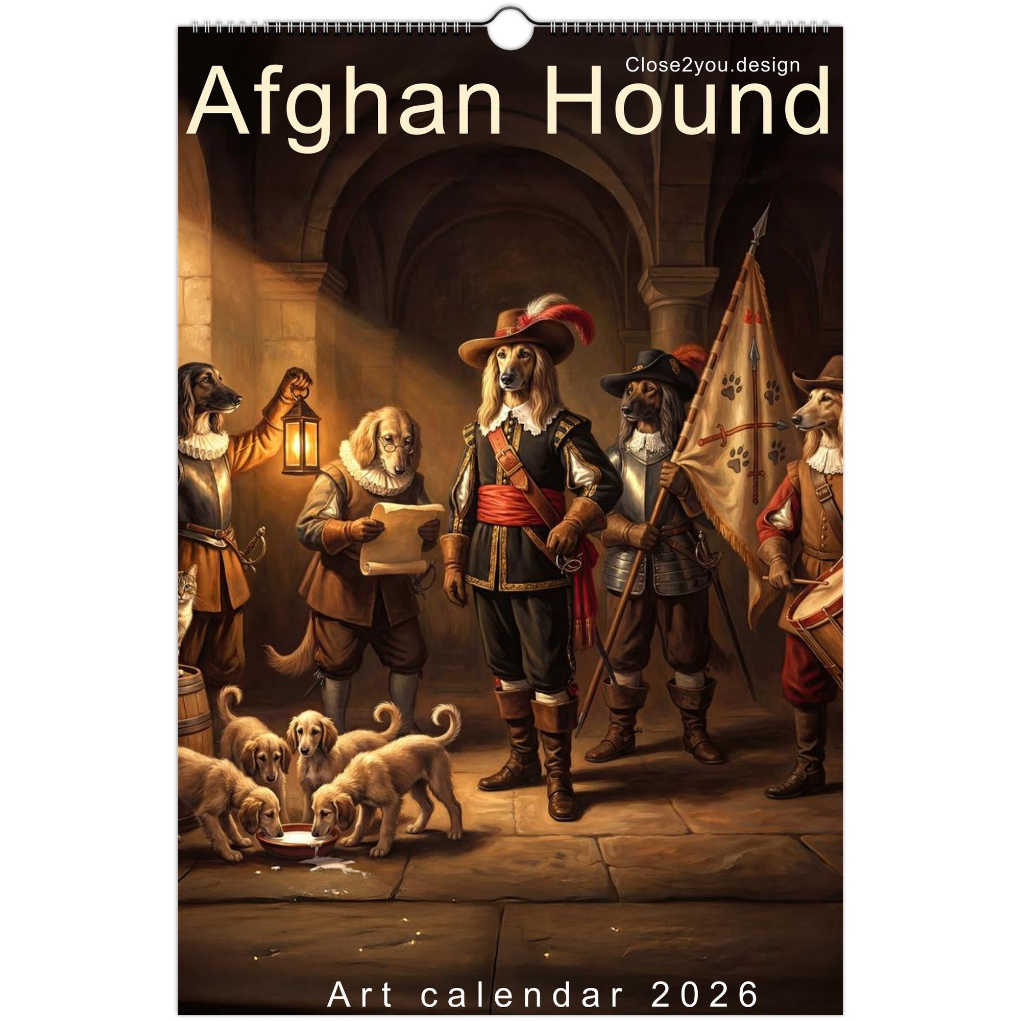 Celebrate the year with a journey through 12 unique artistic interpretations of Afghan Hounds — one for each month. From Van Gogh to Dalí, Rembrandt, and more, this calendar blends fine art with the graceful, elegant charm of your favorite breed.