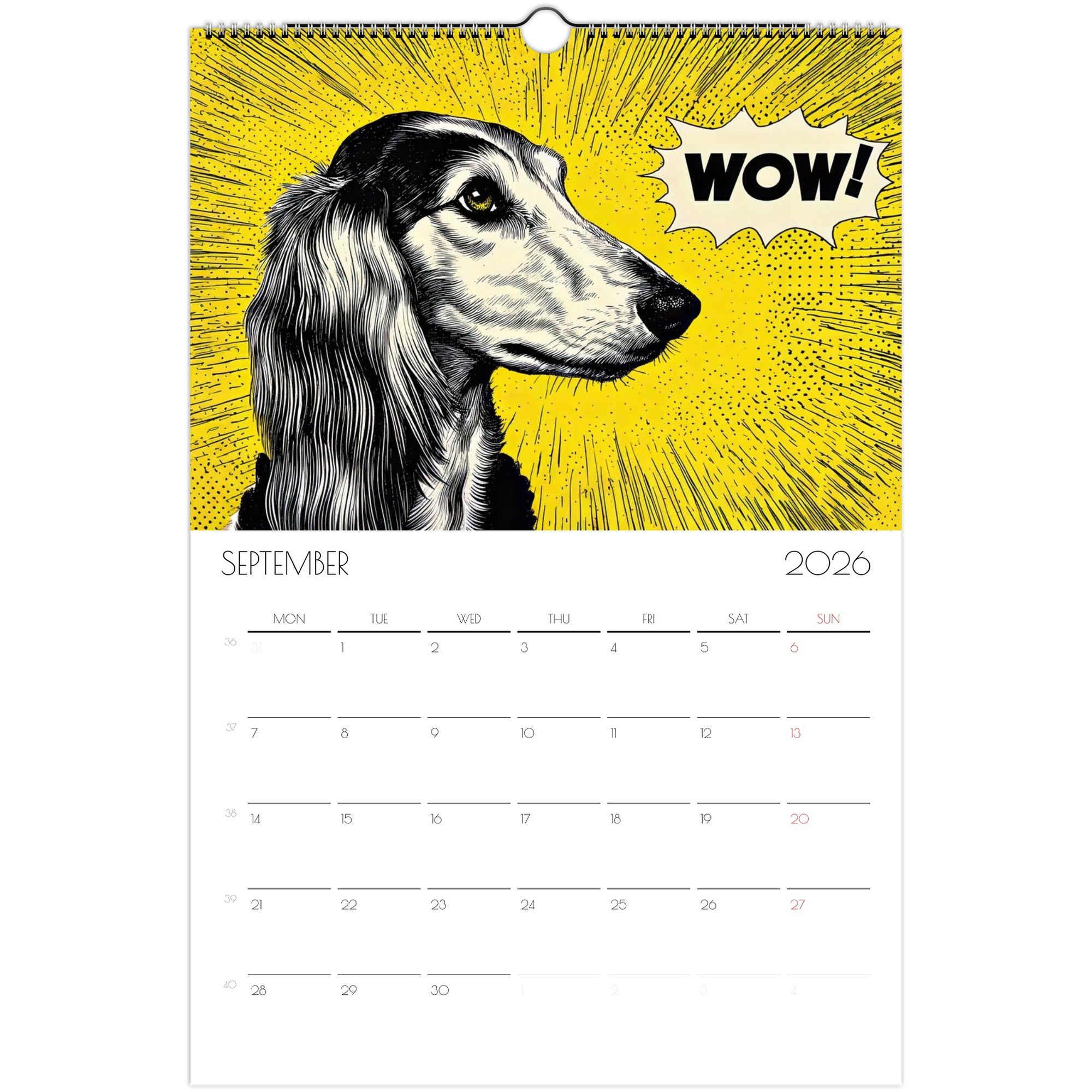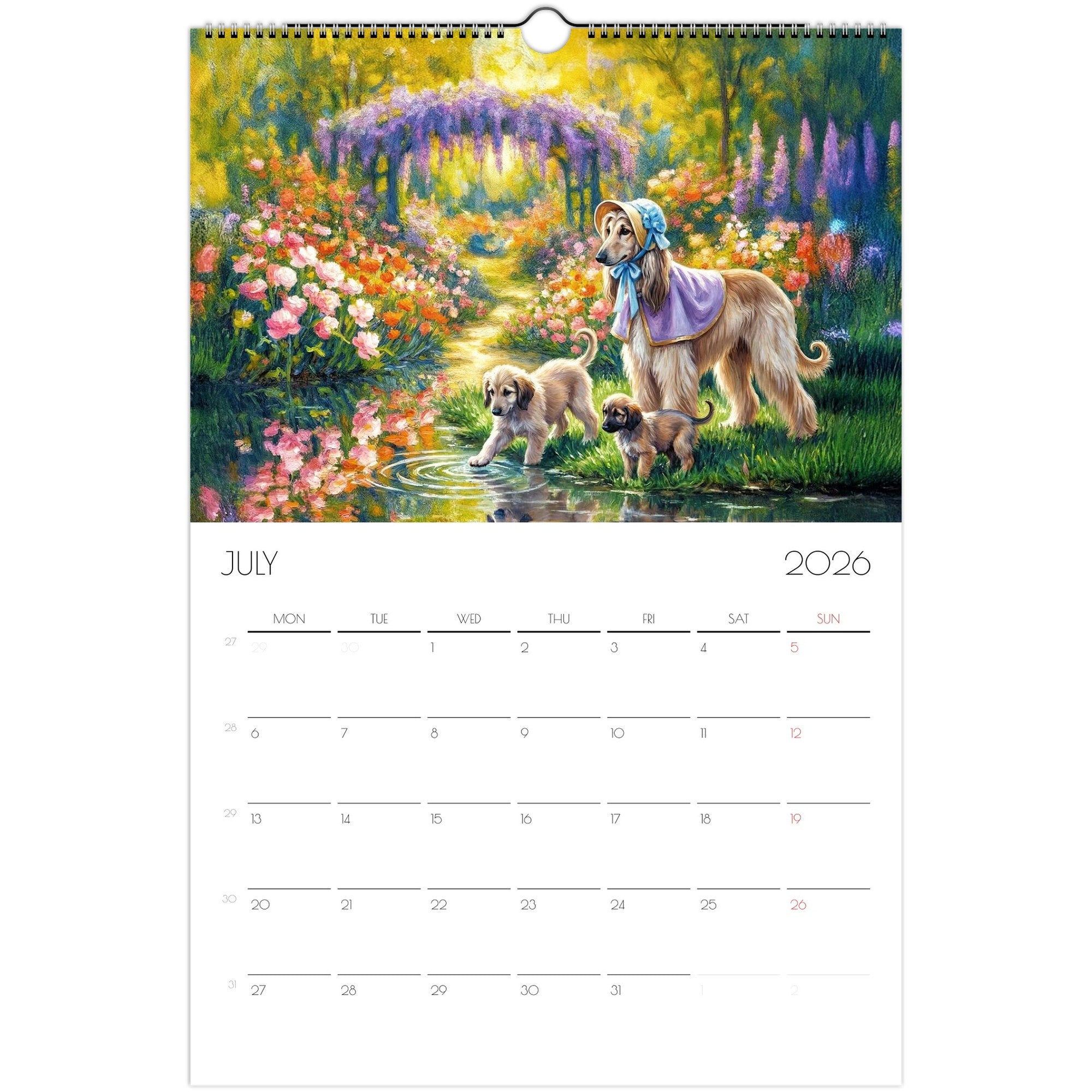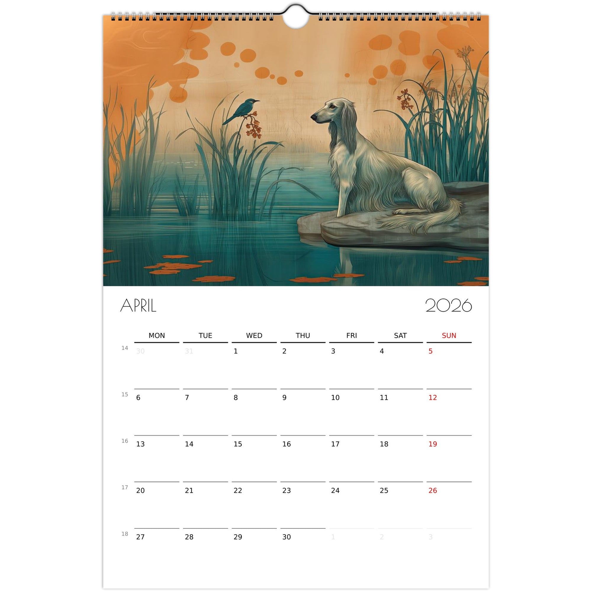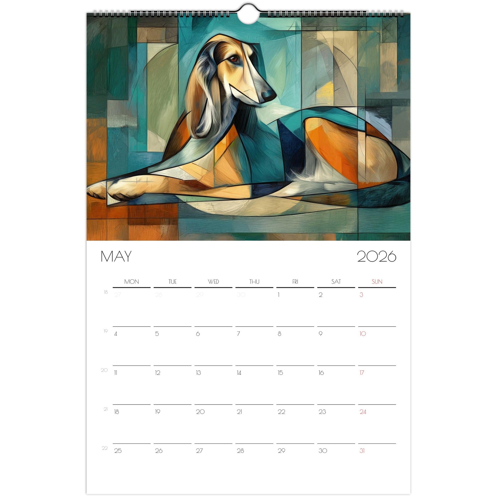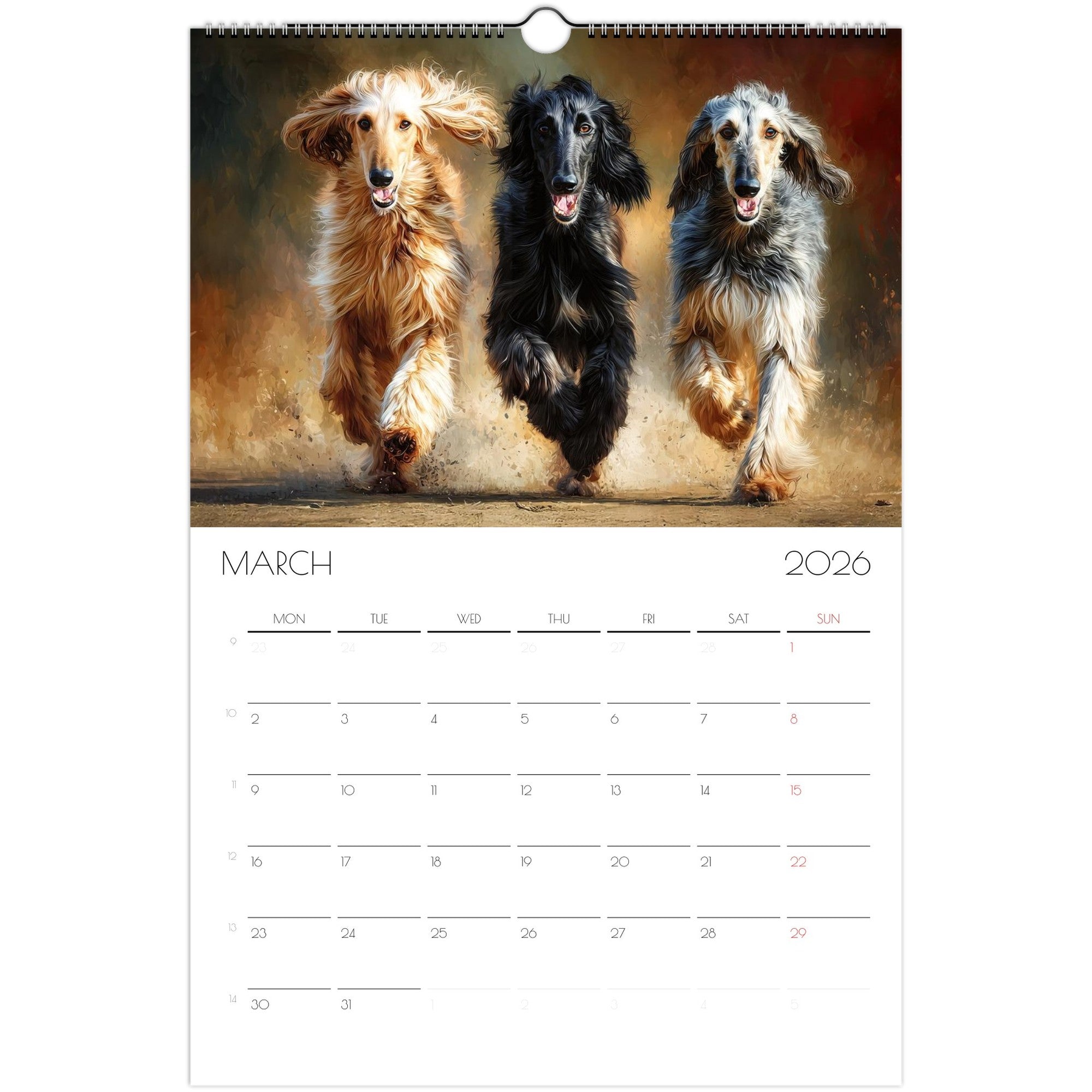 Celebrate the year with a journey through 12 unique artistic interpretations of Afghan Hounds — one for each month. From Van Gogh to Dalí, Rembrandt, and more, this calendar blends fine art with the graceful, elegant charm of your favorite breed.
