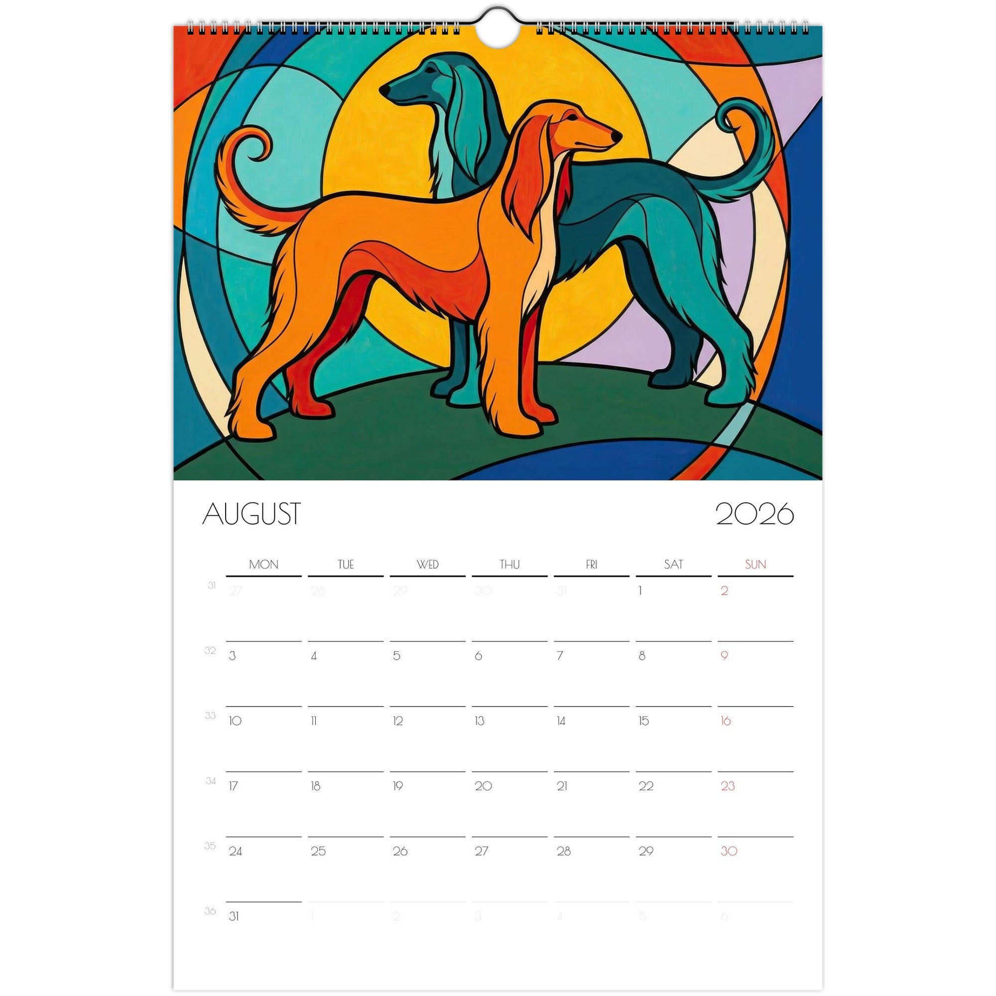 Seven double-sided sheets featuring twelve artist-style Afghan Hound portraits (one per month), a bold cover page, and a beautifully designed back page.