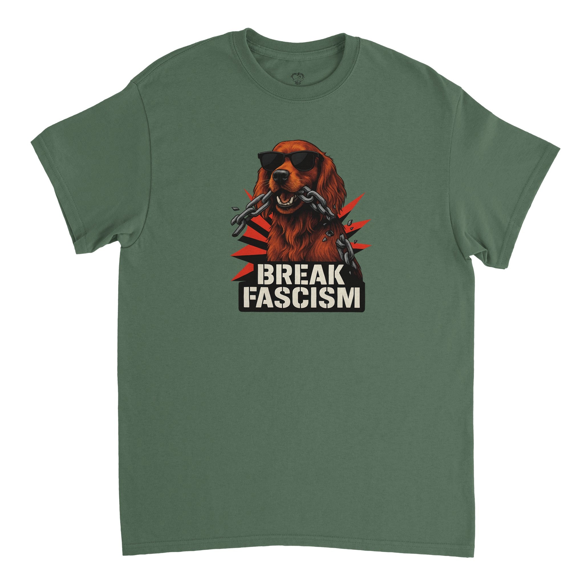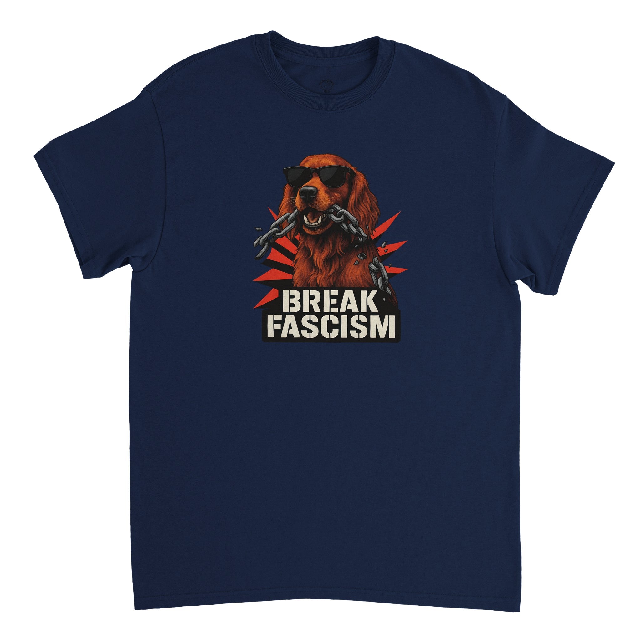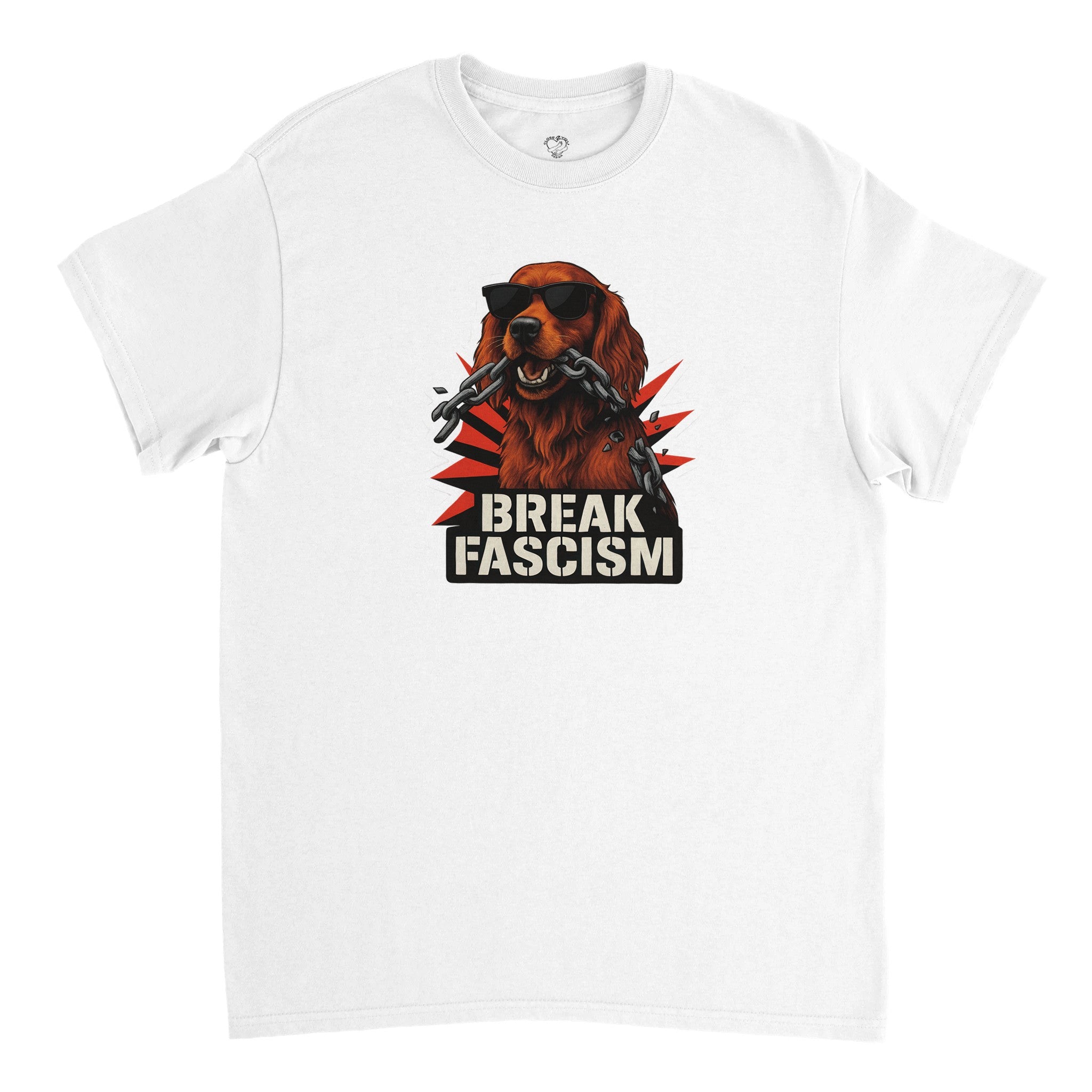 This heavyweight statement tee features a fearless Irish Setter in shades, smashing through chains with the bold message โBreak Fascism.โ Loud, bold, and impossible to ignore โ sometimes a shirt should do the shouting for you.