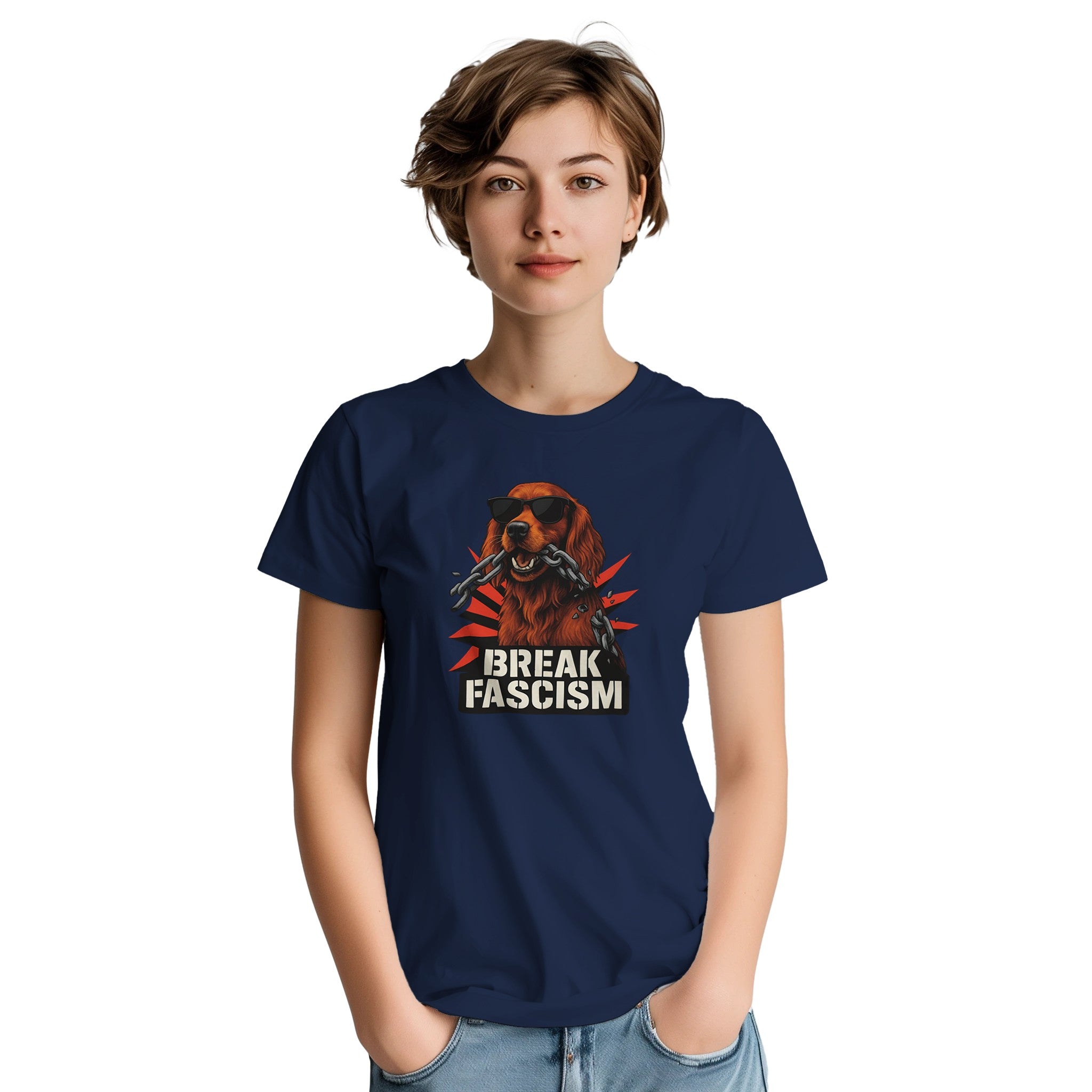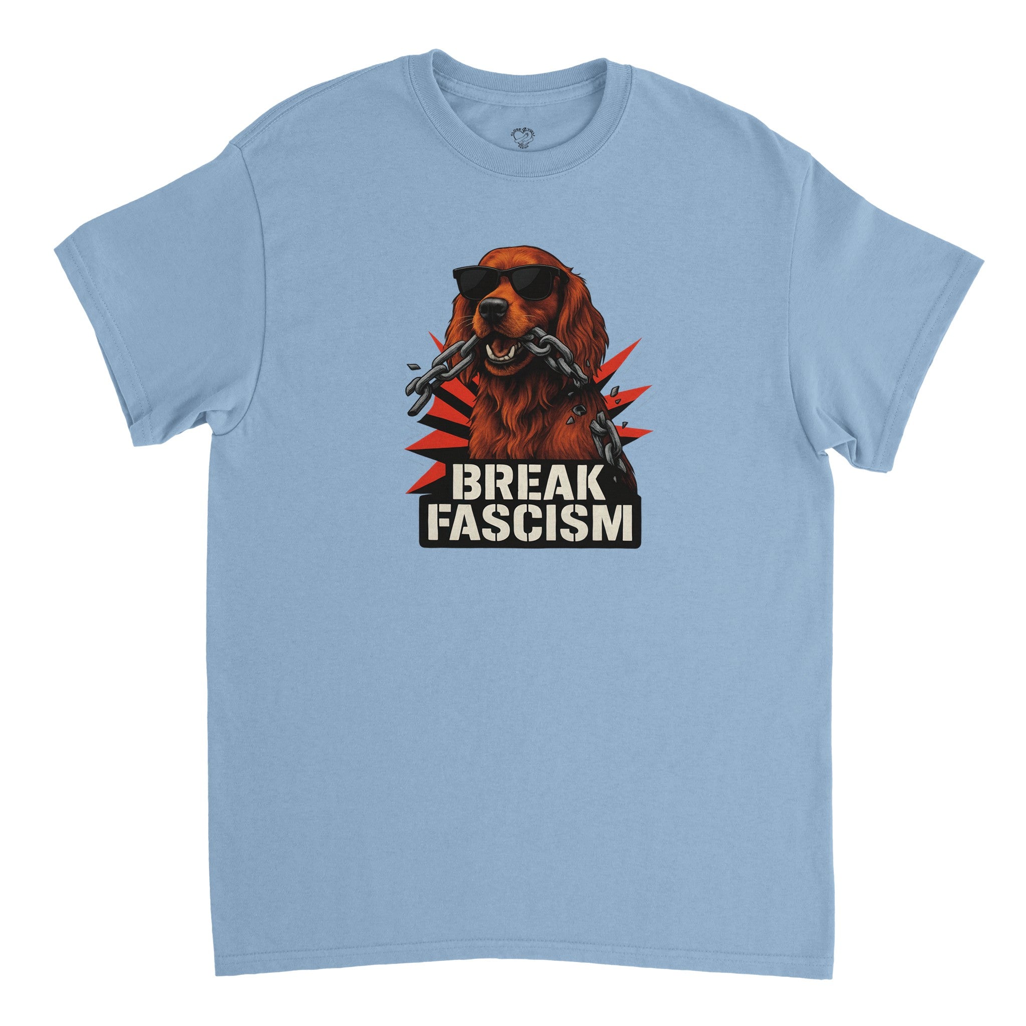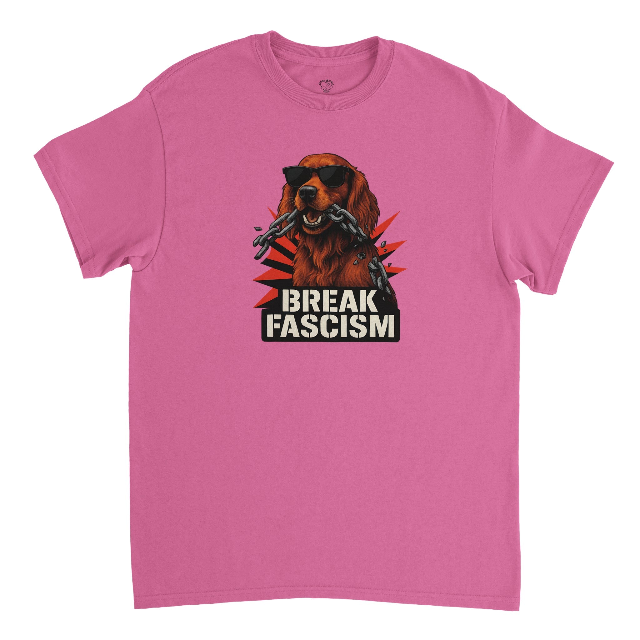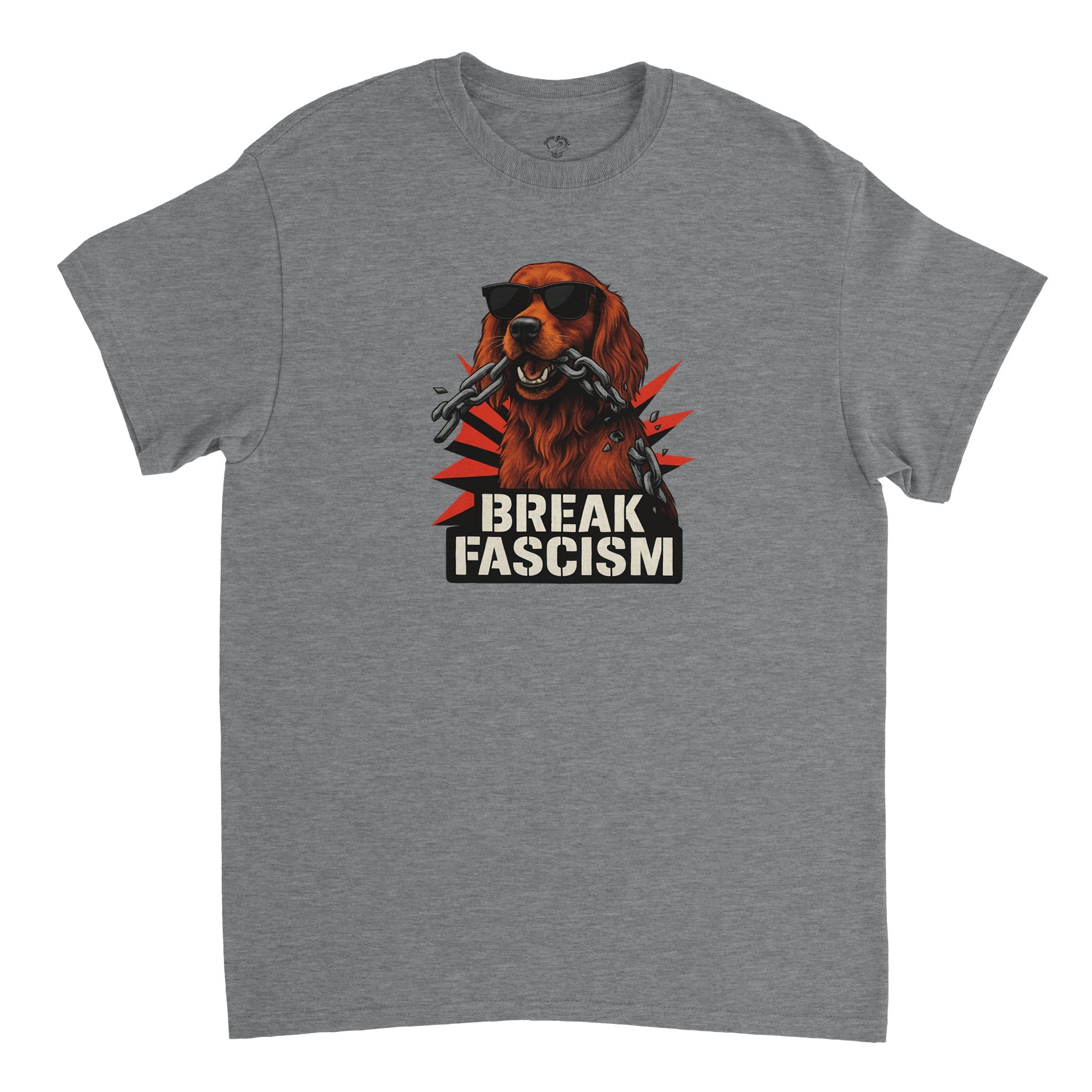 This heavyweight statement tee features a fearless Irish Setter in shades, smashing through chains with the bold message โBreak Fascism.โ Loud, bold, and impossible to ignore โ sometimes a shirt should do the shouting for you.