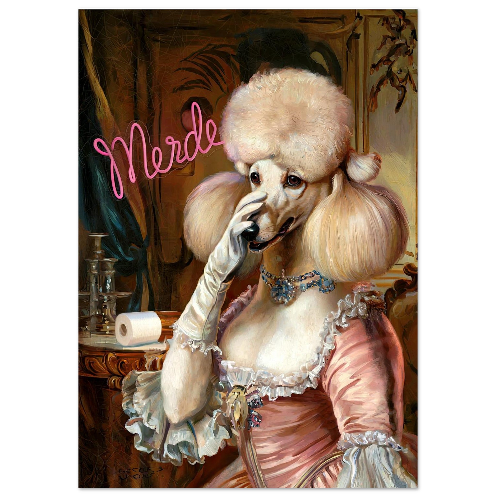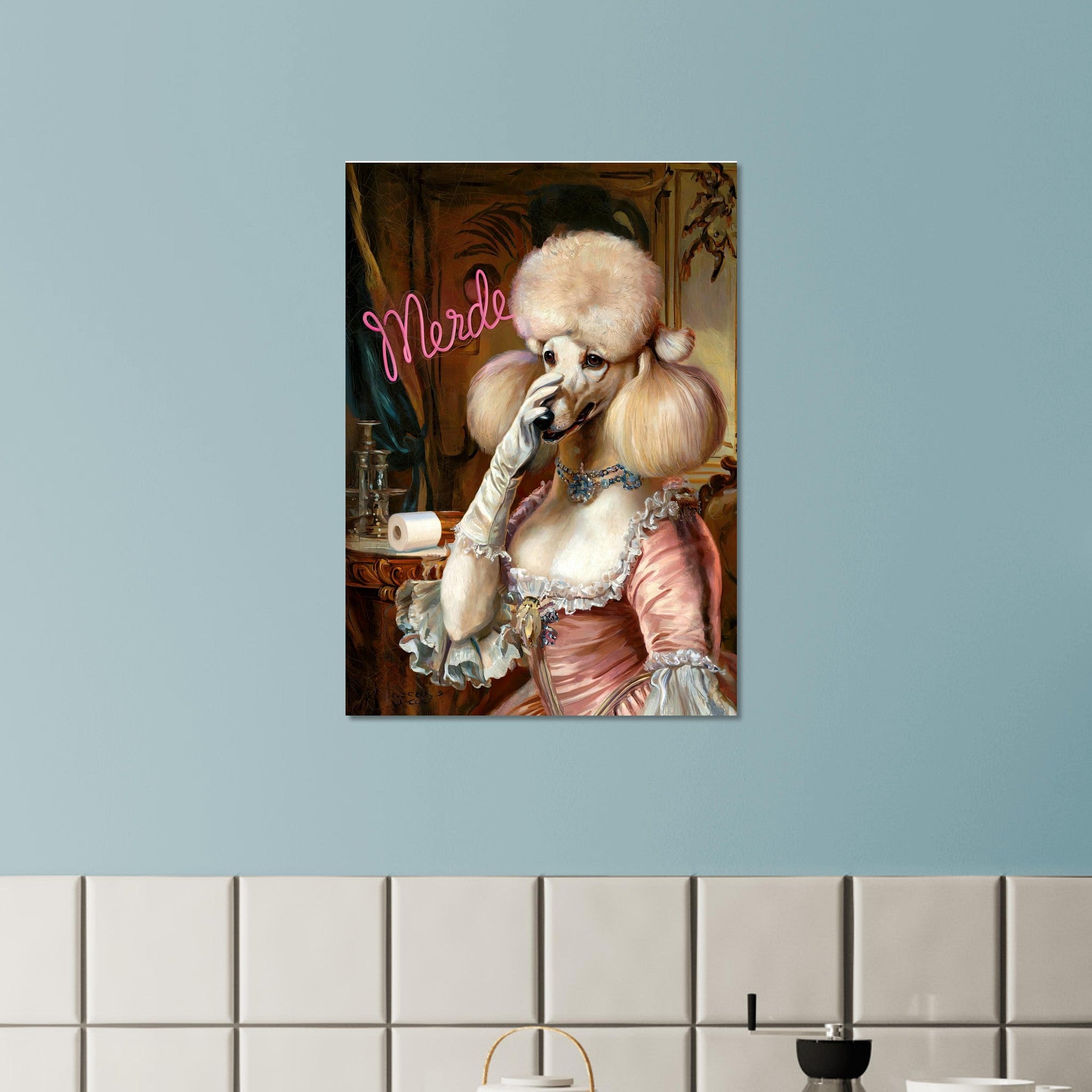 A hilarious and stylish bathroom print that adds a dramatic twist to your toilet wall — perfect for lovers of French flair and fancy dogs. 🐩