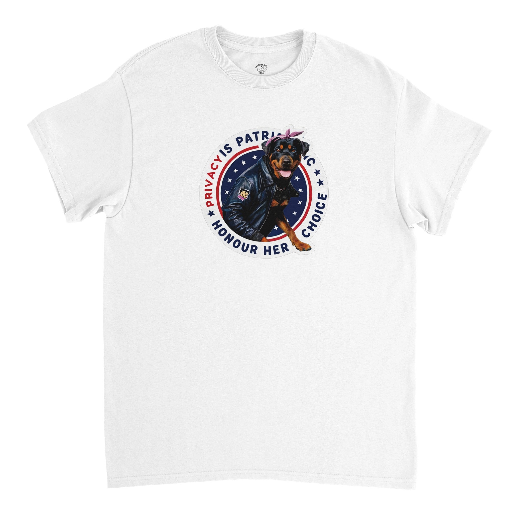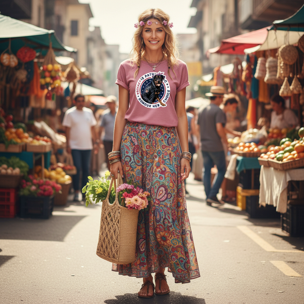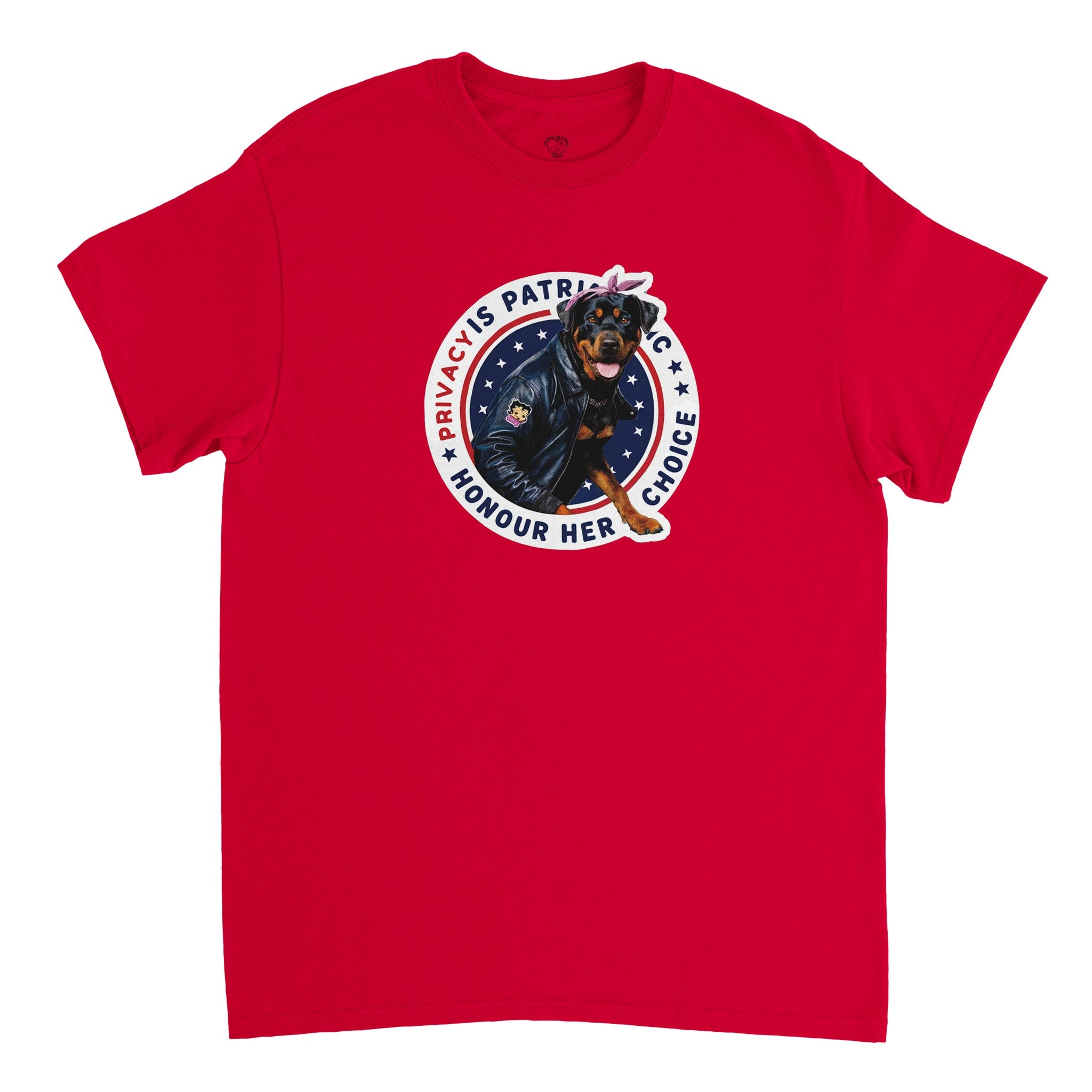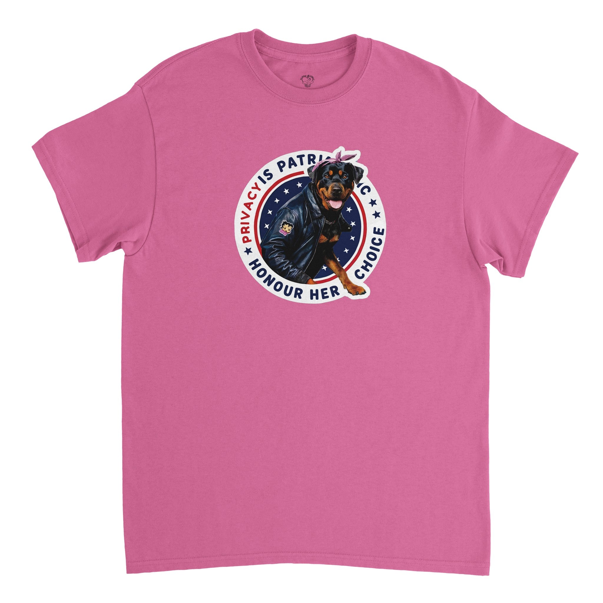 This rottweiler stands for strength, respect, and the right to decide for yourself. With a leather jacket, pink bandana, and a powerful stance, this design mixes bold style with a message that matters: freedom over your own body.