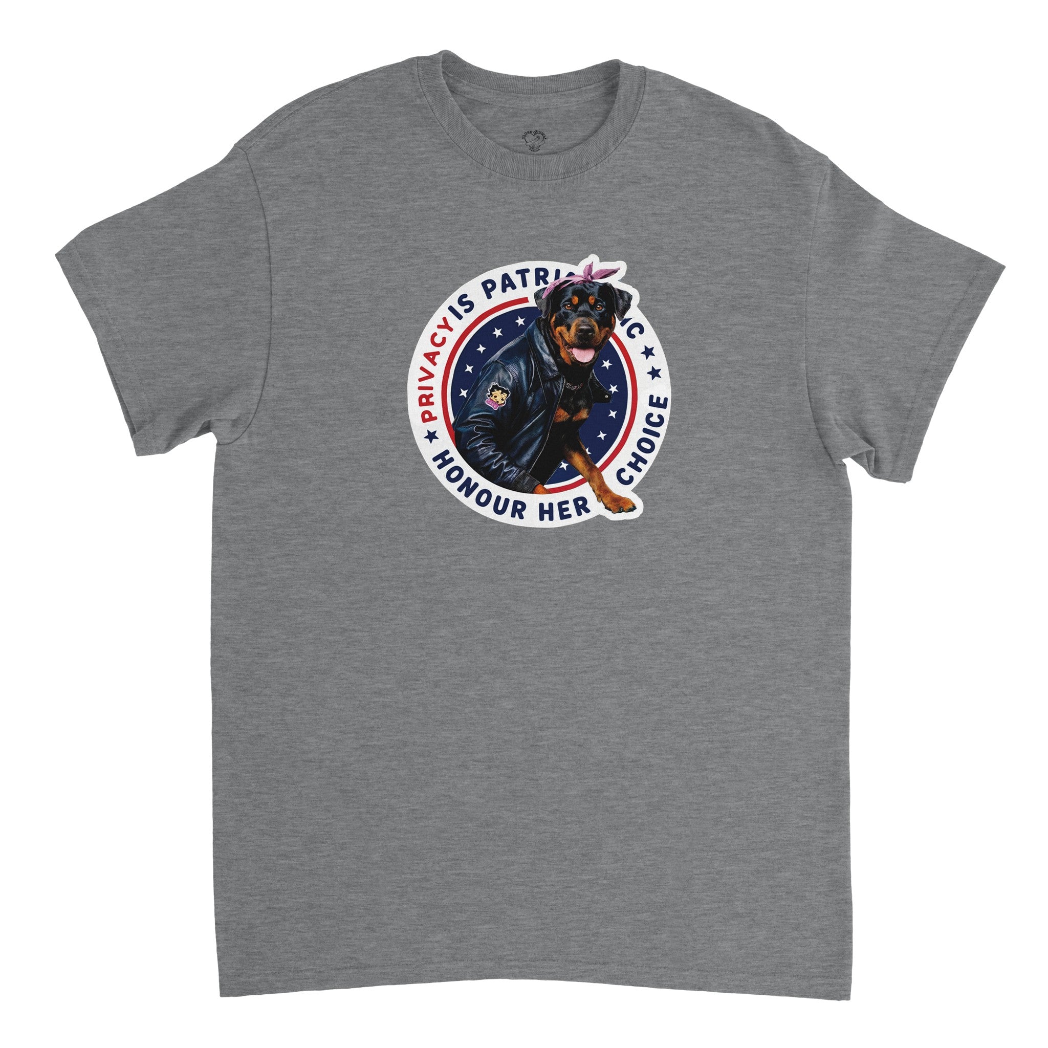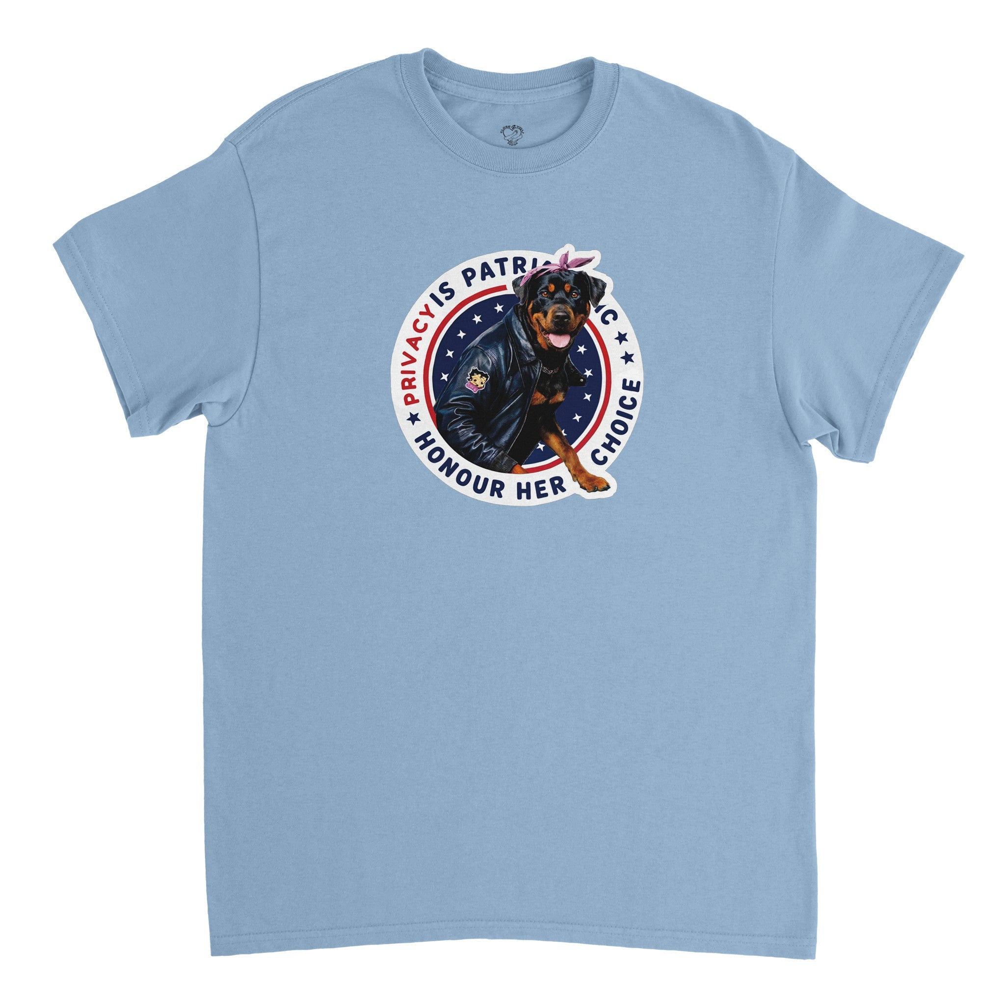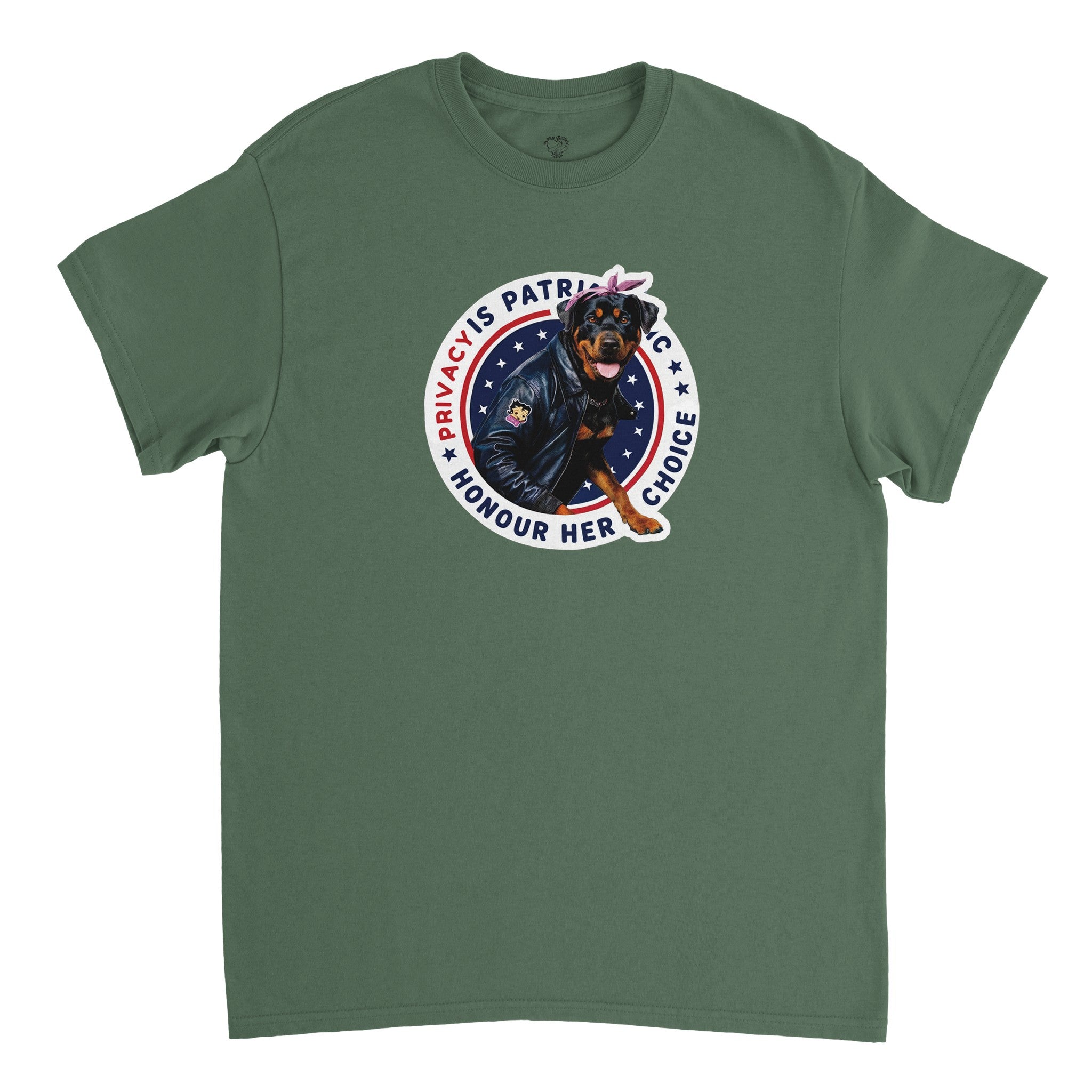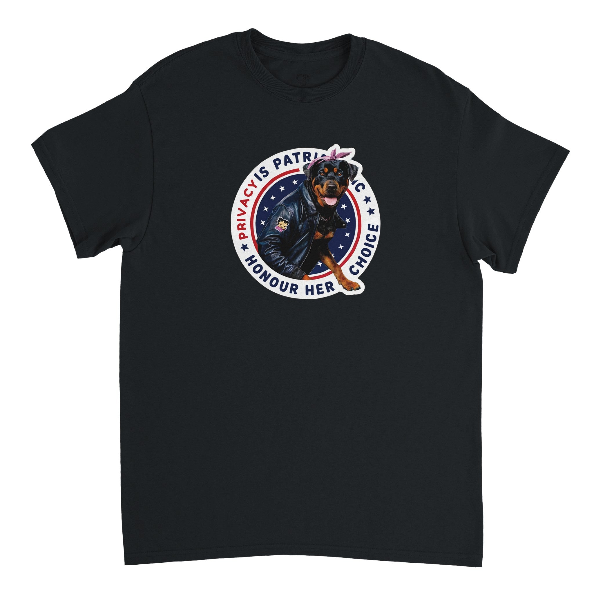 This rottweiler stands for strength, respect, and the right to decide for yourself. With a leather jacket, pink bandana, and a powerful stance, this design mixes bold style with a message that matters: freedom over your own body.